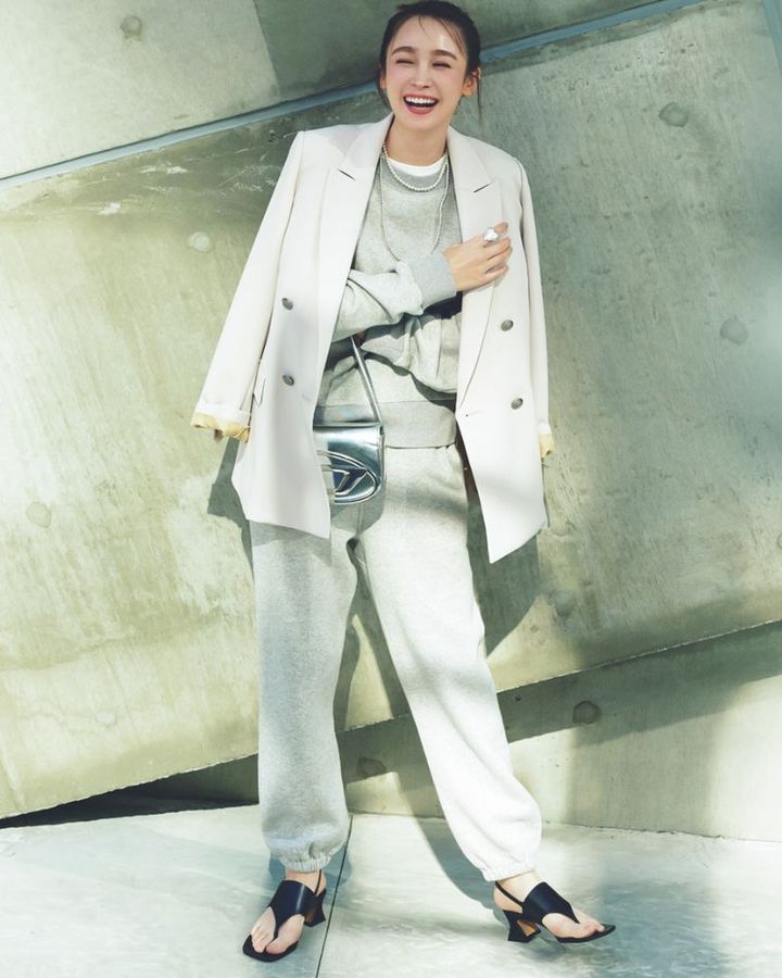 ジャケット¥31,900(アルページュストーリー プレスルーム)スウェット¥17,600パンツ¥19,800(ともにザ シンゾーン/シンゾーン ルミネ有楽町店)Tシャツ¥3,990(UNFILO/オンワード樫山)バッグ¥89,100(ディーゼル/ディーゼル ジャパン)靴¥10,500(CHARLES & KEITH JAPAN)ネックレス〈短〉¥4,499〈長〉¥5,995(ともにデッサン/ワールド プレスインフォメーション)リング¥1,870(セピカ/ジオン商事)