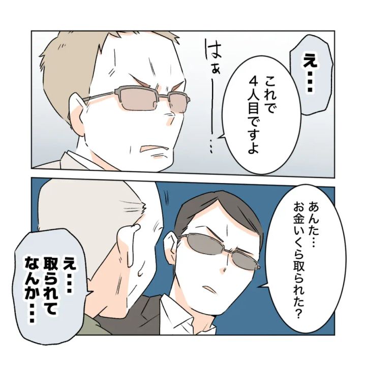 「え・・」呆然とする義父に、「はぁー・・これで4人目ですよ」と呆れたように呟かれた義父。すると「あんた・・お金いくら取られた?」もう一人の男性に聞かれて、「え・・取られてなんか・・」と答えると、