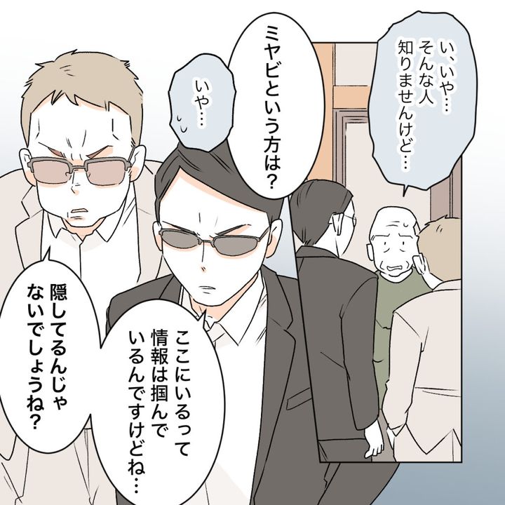 「い、いや・・そんな人知りませんけど・・」と答えると、「『ミヤビ』という方は?」とまた違う名前が。思い当たらない義父が「いや・・」と返事をすると、「ここにいるって情報は掴んでいるんですけどね・・」「隠してるんじゃないでしょうね?」2人の男性が凄みながら言いました。