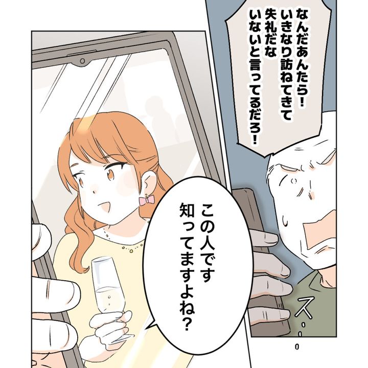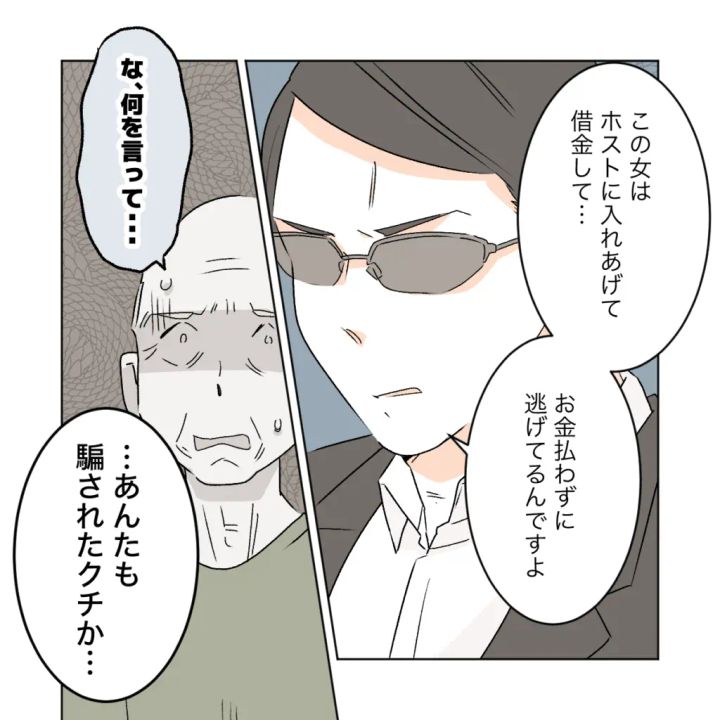 突然やって来た怖そうな男性二人に「『コバヤシノリコ』さんは?ミヤビという方は?」と次々と名前を出され、意味が分からない義父。「隠してるんじゃないでしょうね」と疑われ大声を出すと、「この人です」と差し出されたスマホに映っていたのはカズハさん!ホストに入れあげて借金した挙句、お金も払わずに逃げていると聞き絶句する義父に、「あんたも騙されたクチか・・」「だいたい、『妊娠した』って言い寄られて、退職金全部持っていなくなっちゃったんじゃないの?」と義父に起きたことをズバリ!戸惑う義父に「それが彼女の手口。あんた騙されてたんだよ」と言われ反論する力もありませんでした。
