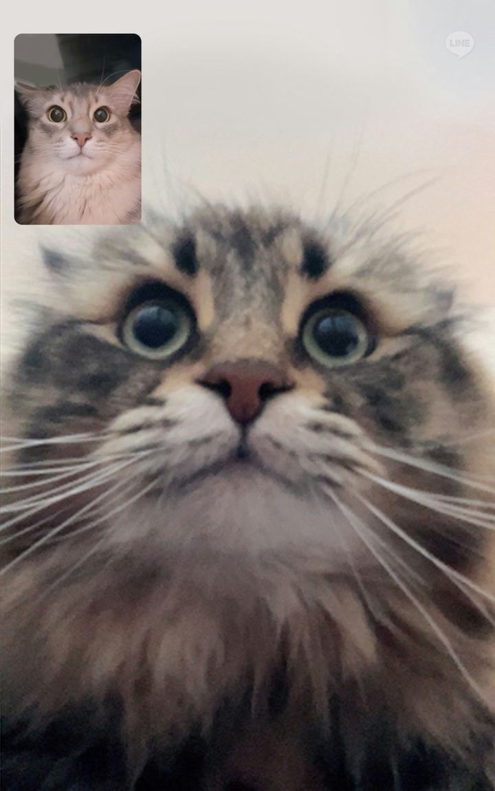 画面いっぱいに猫たちの顔が表示されていて、まるでリモート会議をしているみたいですね。目をぱっちり開いて見つめる姿から、お互いに相手へ興味を持っていることが伝わります。「そっちの飼い主さんはどんな感じ?」「ちゃんとごはん出るかな?」と確認しているのでしょうか?飼い主さんだけでなく、猫同士でも引き継ぎをしているのかもしれませんね。