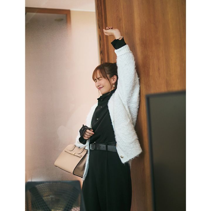 インナーのフロント部分にデザインがあるときは、前を開けてその部分を出して羽織ると◎。ジャケットではなくふわふわ素材の白カーデを選ぶことで、ダークカラーコーデでもリラクシーで優しげな印象を与えます。ジャンプスーツはベルトでウエストマークすることで、オフィスにふさわしいきちんと感&スタイルアップ効果をオン。