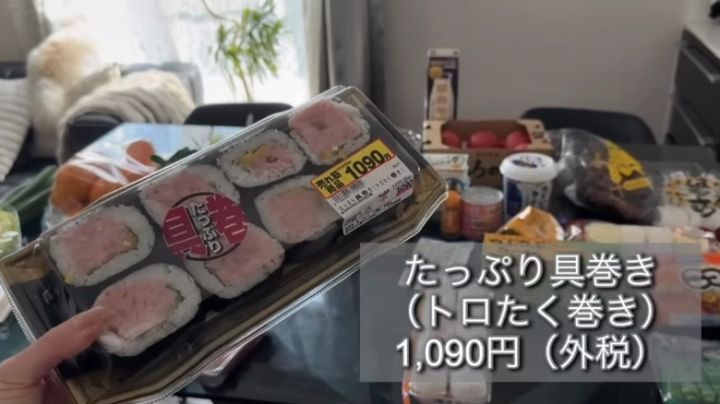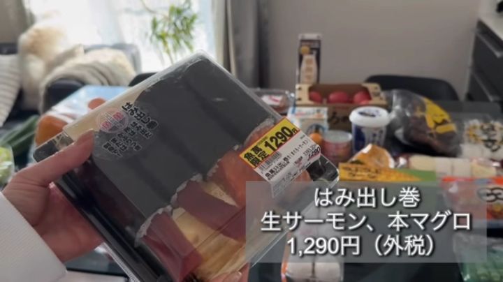 ロピアの大人気商品「はみ出し巻」。こちらは生サーモン2本、本マグロ2本の計4本入りで、びっくりするほどネタがはみ出しています。見た目のインパクトにも、そのおいしさにも、前回食べて感動してしまったそうで、今回ついリピート購入してしまったんだとか。はみ出している部分は、カットしてお刺身としても楽しめます♪