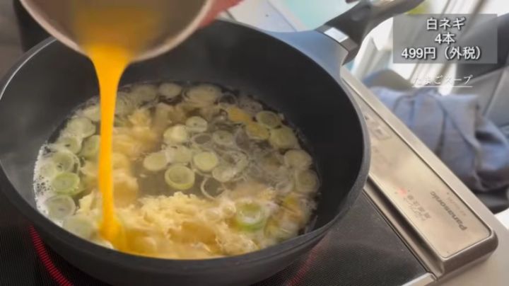 MEGURIさんは、お昼ご飯の一品としてたまごスープを作っていました。お湯に「味覇(ウェイパー)」を溶かして小口切りにした白ネギを加え、溶きたまごを回し入れます。最後にごま油で風味づけしたら完成!