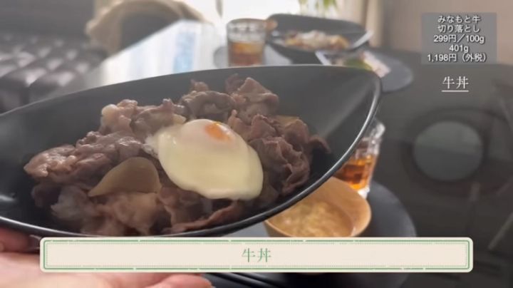 MEGURIさんは、みなもと牛の切り落としを使って牛丼を作っていました。合わせ調味料に玉ねぎを入れて熱し、牛肉を加えます。ほどよいサイズにカットされているので、そのまま調理できるのもうれしいポイント。火が通ったら器にごはんをよそって牛肉・玉ねぎをのせ、温泉卵をトッピングして贅沢な牛丼の完成です♪