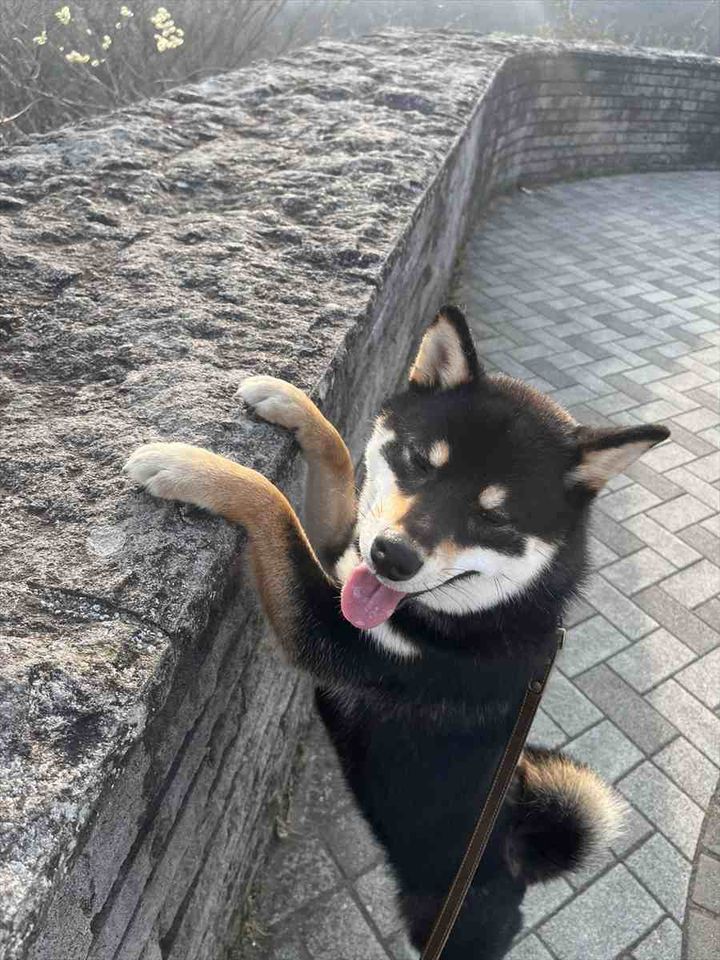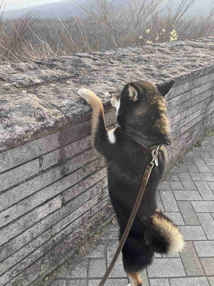 展望台で景色を見ていた飼い主さんの隣で、同じ景色が観たかったんでしょうか。 何が見えているのか気になったのかもしれませんね。