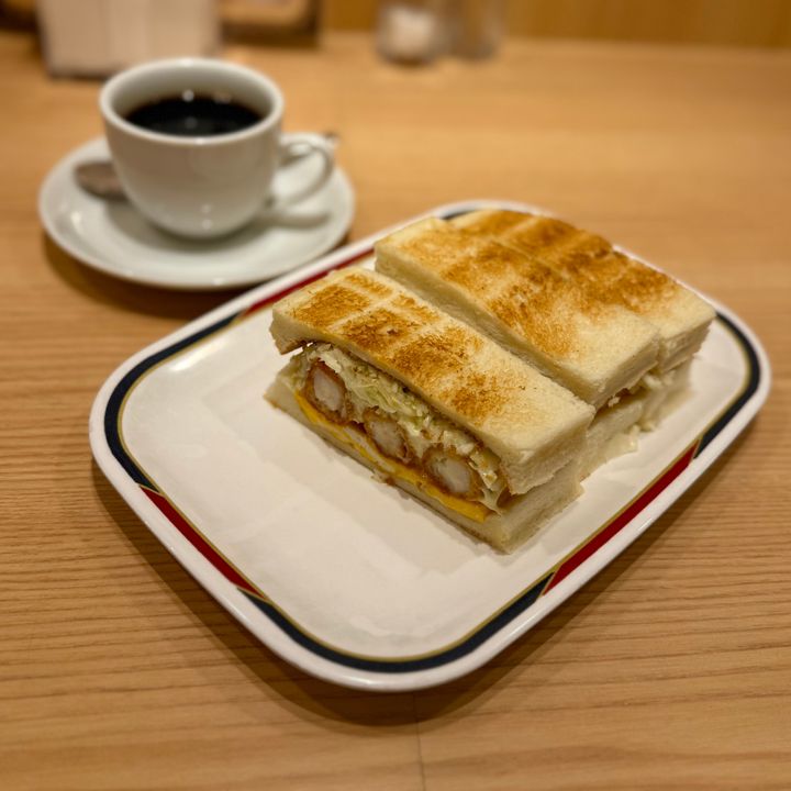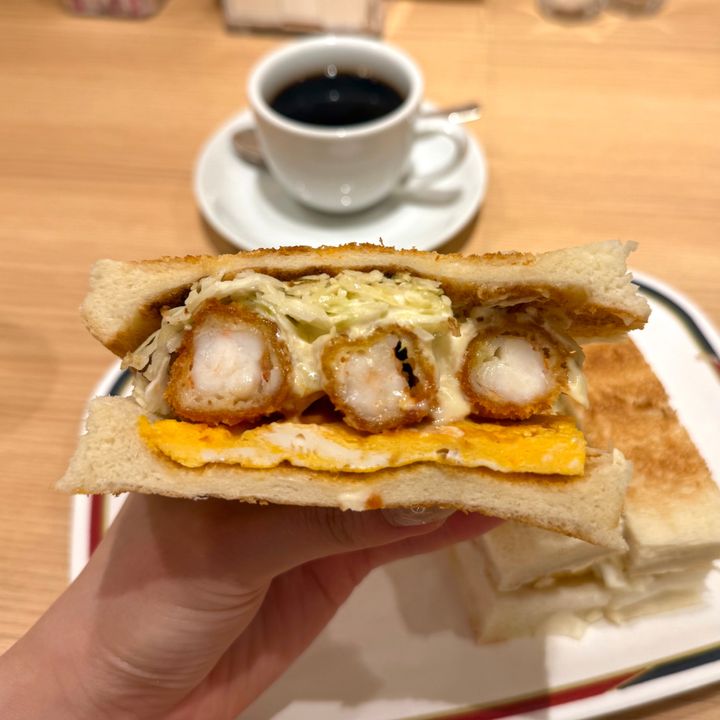 私はホットコーヒーと一緒に、名物のエビフライサンドを注文しました!