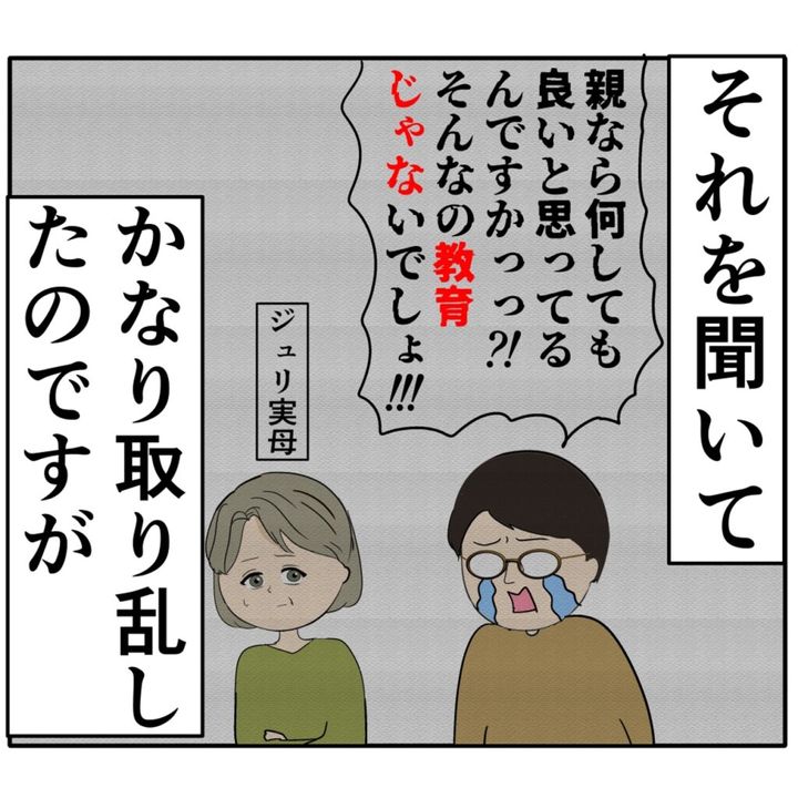 それを聞いためが根さんはひどく取り乱し、「親なら何しても良いと思ってるんですかっ?!そんなの教育じゃないでしょ!!!」とジュリ実さんの母親に詰め寄りました。