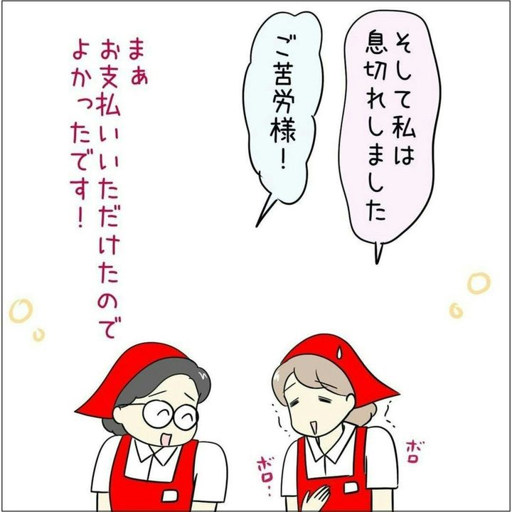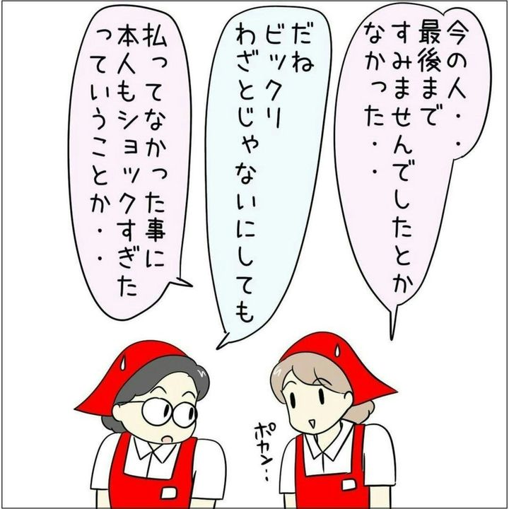 未払いのお客さまを特定するため、館内を2往復した あとみさん、本当にお疲れさまでした!日々、わたしたちの生活を支えてくれているスーパーの店員さんに対し、改めて感謝したくなる作品です。
