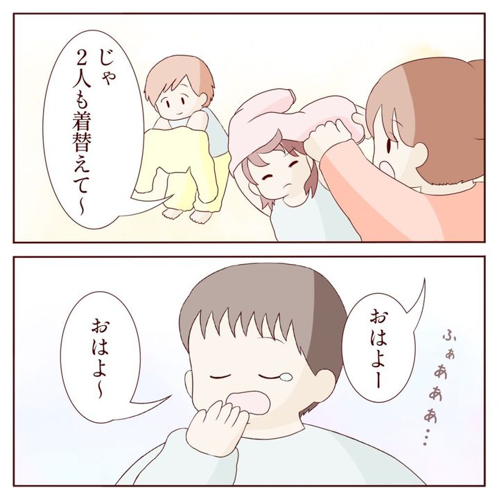 次は着替えです。まだ一人で全部着替えができないクルミのサポートをしていると、大きなあくびをしながらようやく夫が起きてきました。