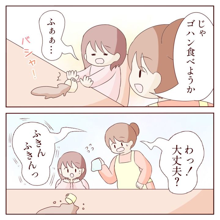 お次は朝食です。すると、寝ぼけたクルミがお茶をこぼしてしまいました。テーブルを拭くなどいつもより時間がかかってしまった朝食を終え、