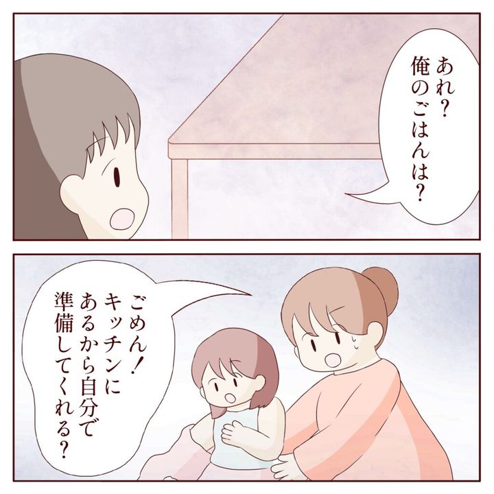 のんびり起きてきた夫は、テーブルの上を見て一言。「あれ?俺のごはんは?」クルミの着替えのサポートで手が離せなかった私は「ごめん!キッチンにあるから自分で準備してくれる?」とせかせかしながら伝えました。