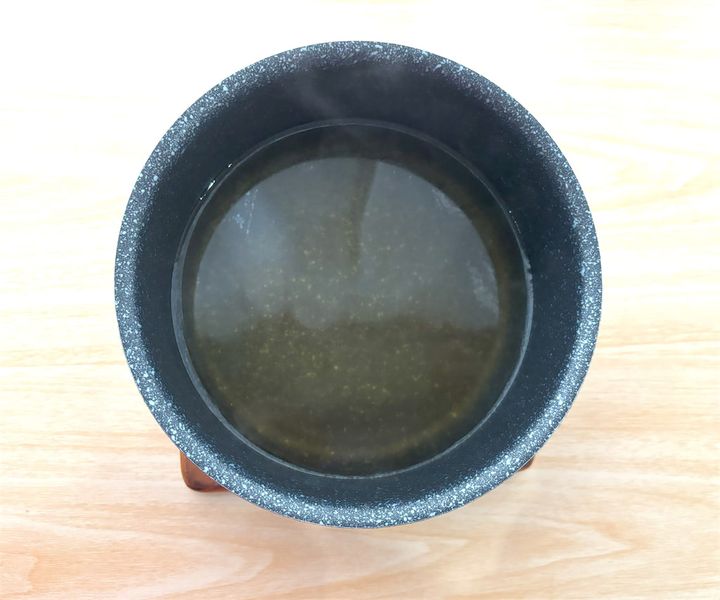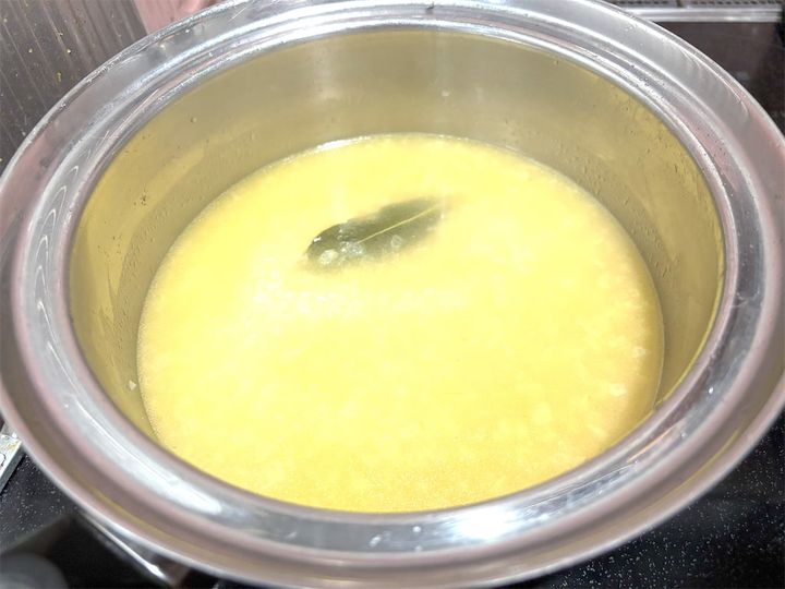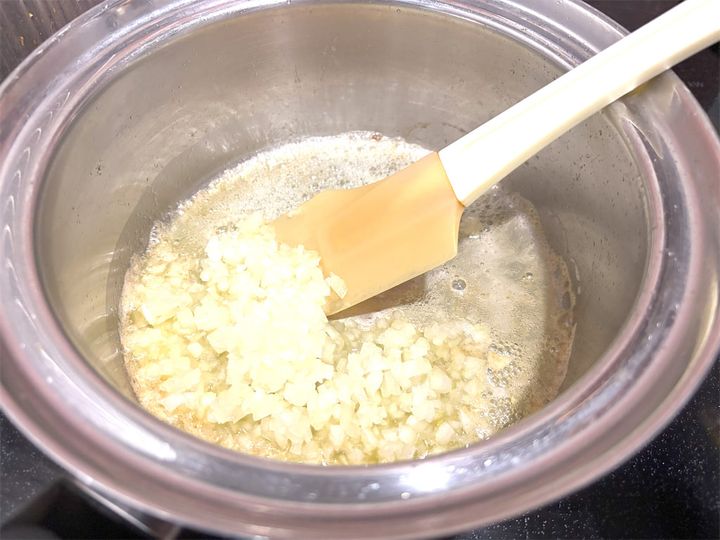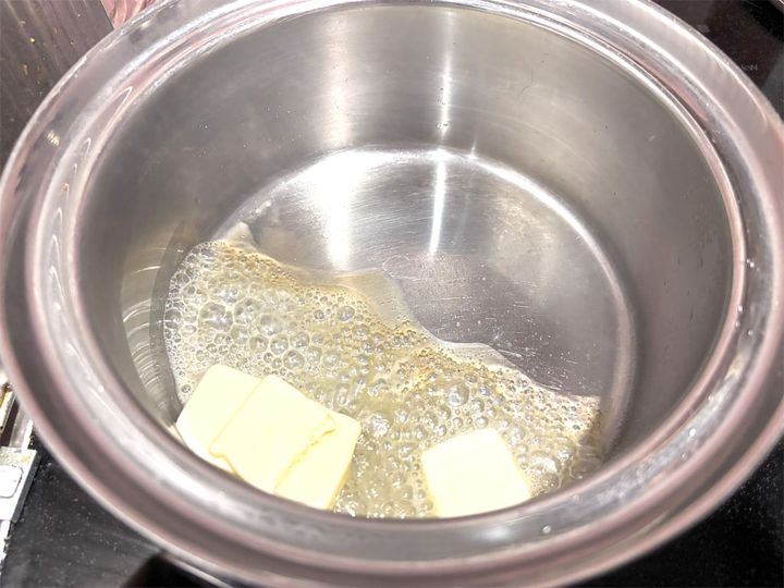 バターを弱火(IHクッキングヒーターだと140℃くらい)で焦げないように鍋で溶かしたら、