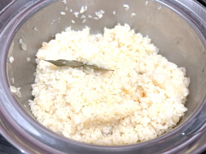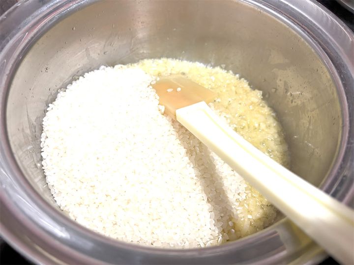 米が割れないようにそっと混ぜて、米がバターを吸って透明になるまで炒めます。