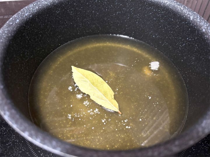 チキンブイヨンは温めてから、塩とこしょう、ローリエを入れて温めておきます。