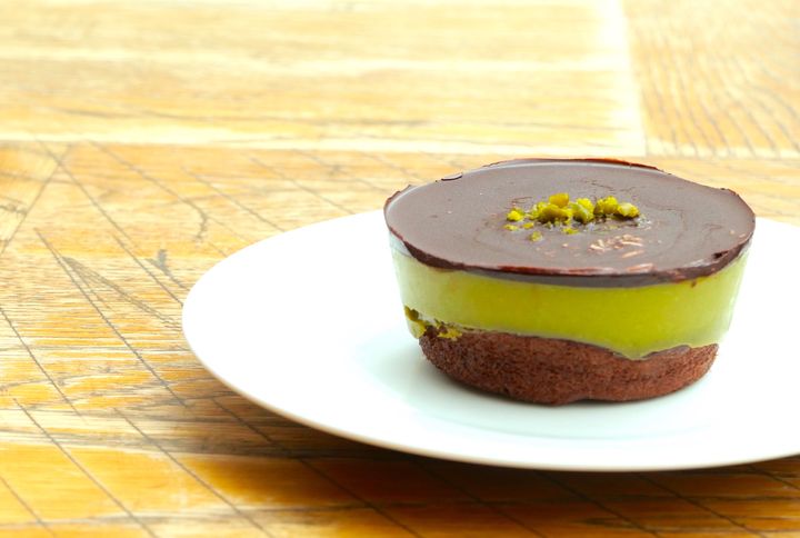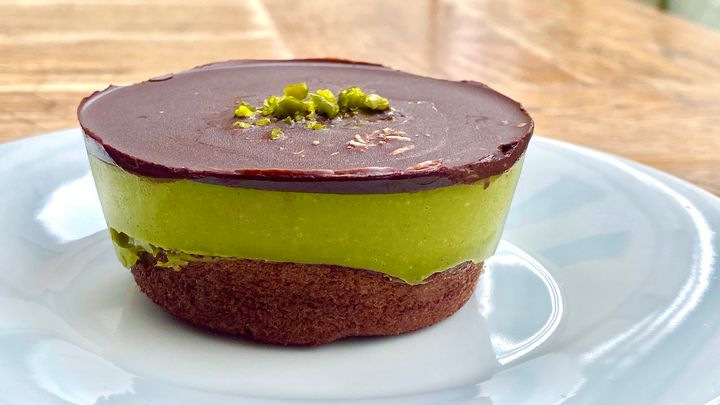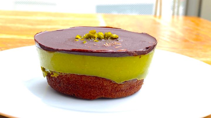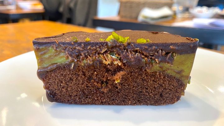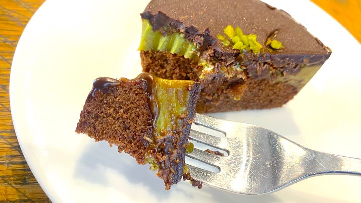 しかし声を大にして言いたい! このケーキの衝撃的なおいしさの秘密は、ピスタチオチョコ生地とコーティングチョコの間に挟まれたカダイフにあり!
