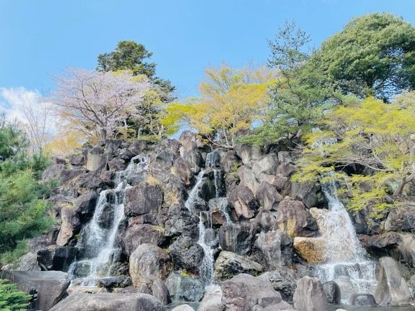 駐車場から歩いてすぐのところに、三連の滝があって驚きました。 若葉と桜の色が映えますね。