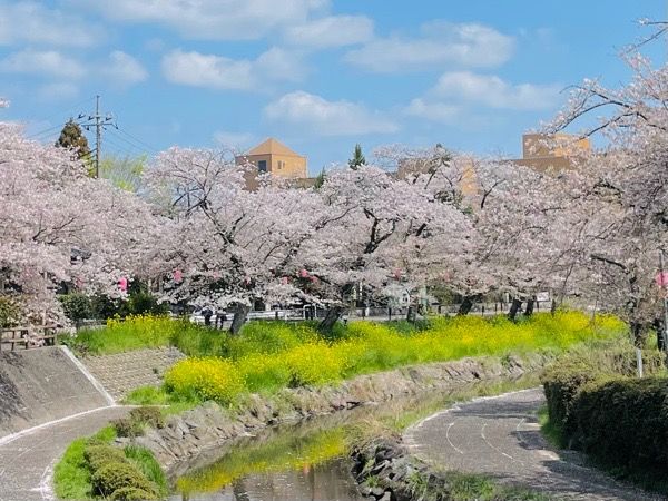 市街地の中心部を流れる行屋川。その両岸にソメイヨシノの古木がズラリ。 訪れたのは4月12日。ちょうど菜の花との競演も見られました。 「桜まつり」の期間はライトアップもされます。 川面を桜の花びらが流れていく様も見られて、夜は幻想的な風景になりそうです。