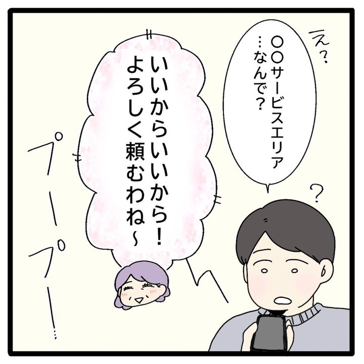 突然の予定変更に「え?〇〇サービスエリア?・・なんで?」と不思議がる夫でしたが、義母はお構いなしに「いいからいいから!よろしく頼むわね~」と明るく言うと一方的に電話を切りました。