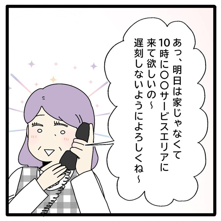 「あっ、明日は家じゃなくて10時に〇〇サービスエリアに来て欲しいの~。遅刻しないようによろしくね~」と決定事項として伝えてきた義母。声の様子から、ウキウキした感じが伝わってきます。