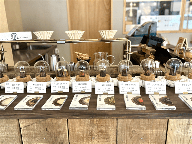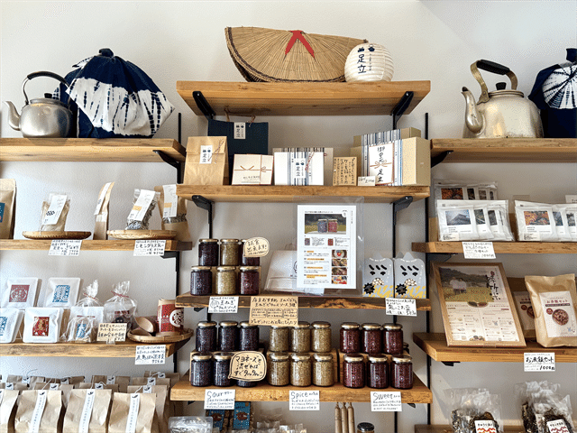 お店で焼いたクッキーや福知山のお菓子、福知山名物「踊せんべい」、お茶、ピクルスなど、おしゃれなパッケージが目を惹くお土産のほか、お店でデザインして作った可愛いデザインのハガキやぽち袋、缶バッチなど、眺めているだけで楽しくなるものが並んでいます。