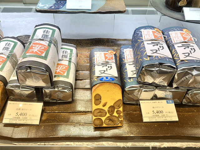 丹波の名産品のひとつ、栗を使ったお菓子を作っている「足立音衛門」。「音衛門の栗のケーキ(税込3,564円)や栗のテリーヌ(税込5,400円)などのパウンドケーキ、手に取りやすい価格の鯛焼(税込280円)や栗焼(税込432円)などの小菓子もあり、手土産やお土産にできるさまざまな商品がそろっています。