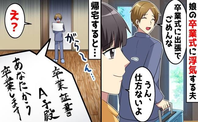 娘の卒業式より不倫旅行を優先した夫。父親として信じられません。娘のために離婚に踏み切れなかった母親の背中を押したのは、まぎれもない娘でした。最終的に浮気男から卒業できてよかったですね。