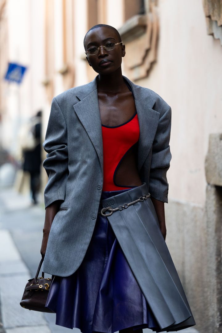 上のスナップは、ミュウミュウの2025-26年秋冬コレクションのオフランウェイでキャッチしたフランスのインフルエンサー、パオラ・ロカテッリ。鮮やかなレッドとブルーのトリミングのバランスが絶妙な水着にレイヤードスカートを合わせ、コントラストが効いた装いに仕上げた。視線が集まるシルバーのベルトもポイントに。