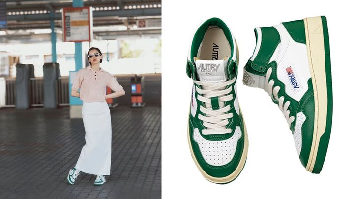 スニーカー[MEDALIST MID]¥39,600(オートリ―/トヨダトレーディング プレスルーム)、ニット¥66,000(マイディ/ビオトープ)、スカート¥28,600(ヨー ビオトープ)、サングラス¥26,180(カリン/WTSROOM)