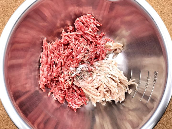 6. ボウルに牛ひき肉、豚ひき肉、塩(2つまみ)、黒こしょうを入れ、粘りが出るまでよくこねます。