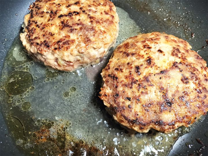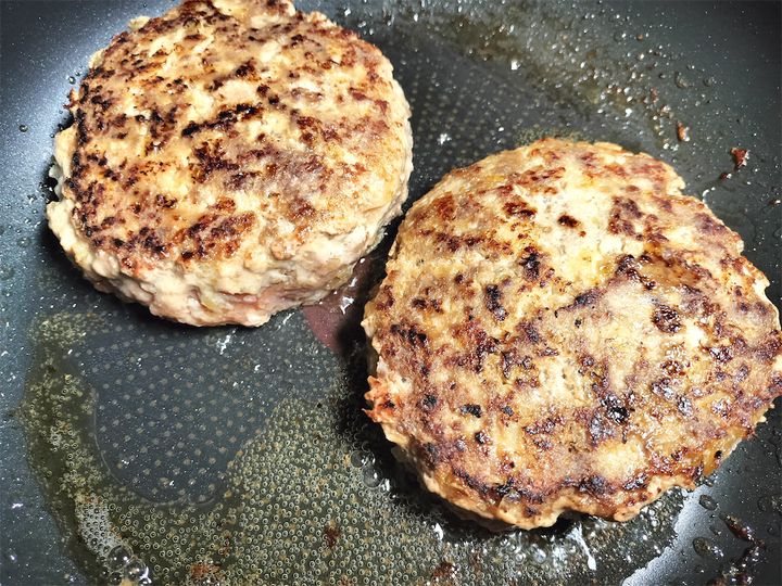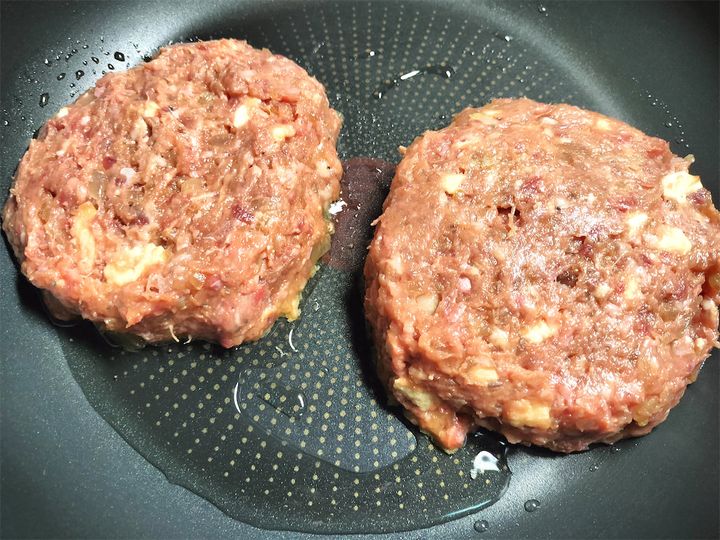 8. フライパンに牛脂を入れ、タネを乗せてスプーンで成形してから中火と弱火の中間で焼きます。