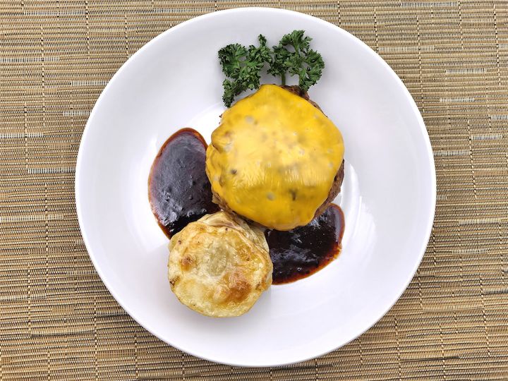ふっくらとしたハンバーグは確かにとてもおいしそうで、その上に乗った黄色いチェダーチーズがまたトロっとして食欲をそそります。