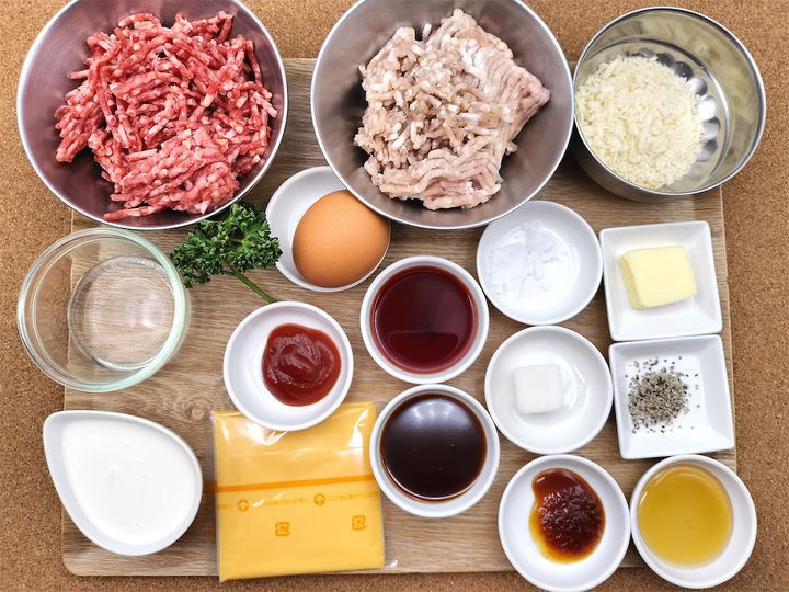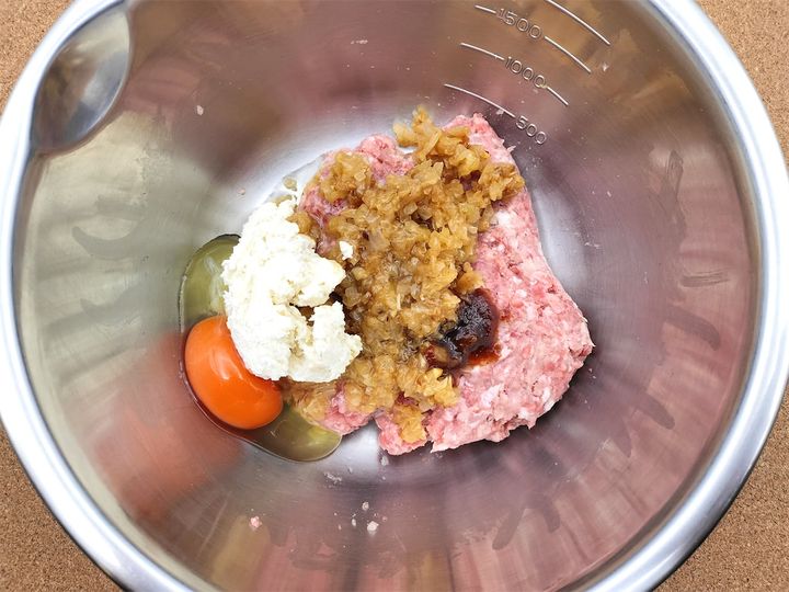 7. 卵、玉ねぎ、焼肉のタレ、パン粉を加えてさらによく混ぜ、2つに分けます。