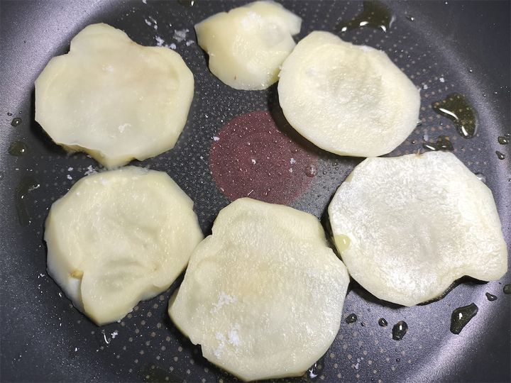 4. フライパンにオリーブオイルを引き、じゃがいもを中火で焼きます。