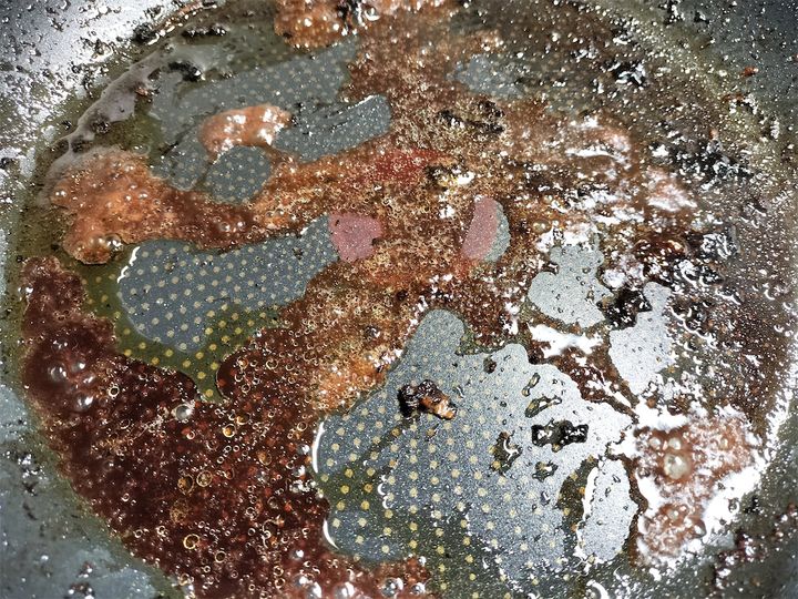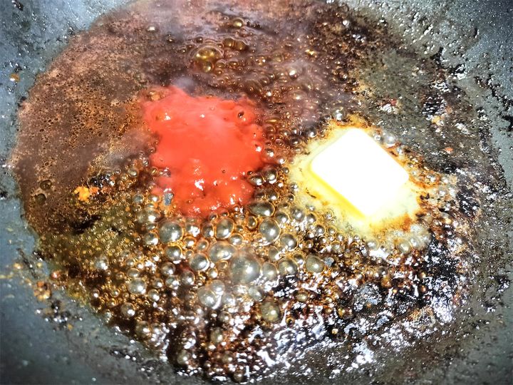13. 赤ワインが煮詰まったらケチャップ、中濃ソース、蜂蜜、バター、水を加え、とろみをつけます。