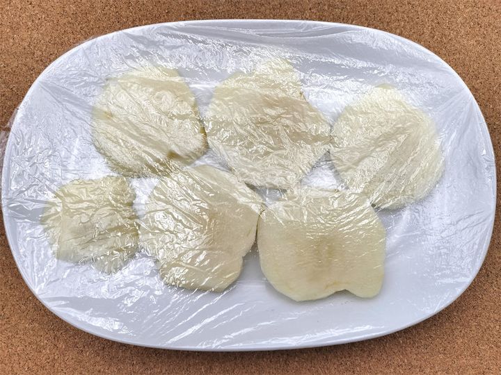 3. 輪切りにしたじゃがいもにラップをかけて、700Wの電子レンジで2分ほど加熱します。