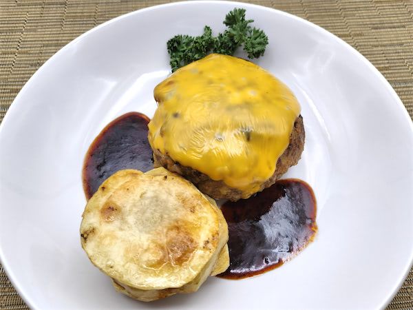 14. ソテーしたポテトを皿に積み上げ、その横にハンバーグを置きます。ハンバーグの横にソースをかけてパセリを飾り、出来上がりです。