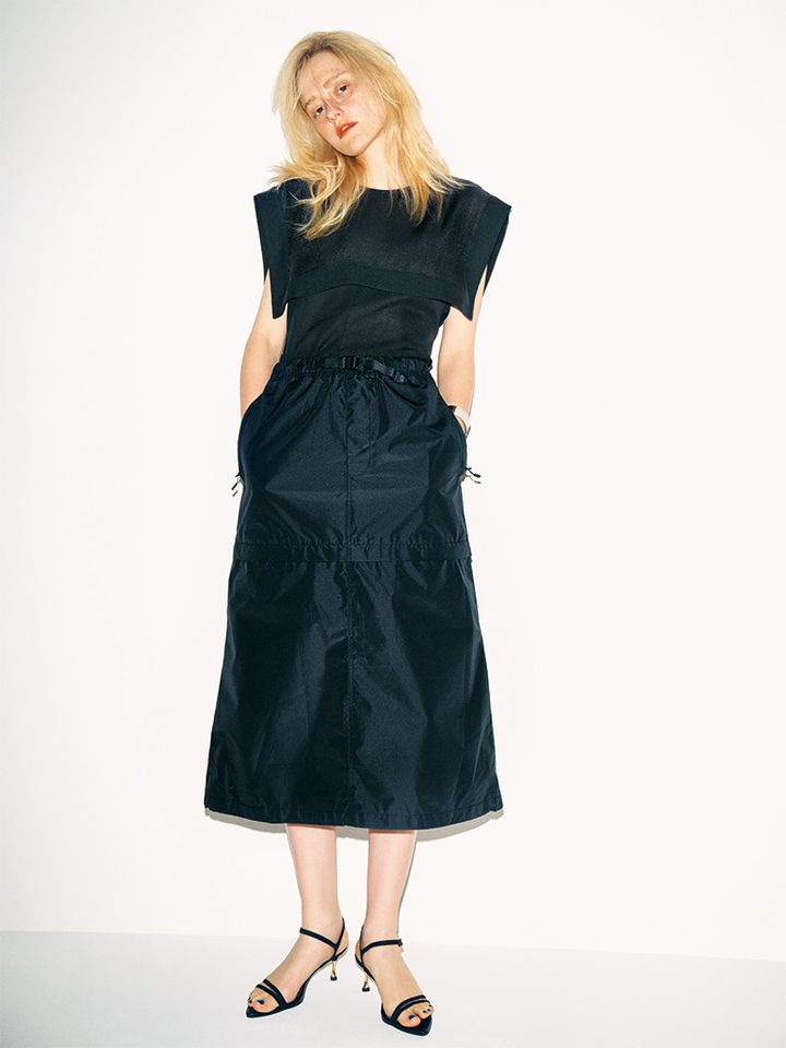【POINT】フェミニンなスクエアカラーのえりつきブラウスの相棒に、スポーティなディテールをあしらったデザインスカートを選択。クセのあるものどうしの掛け算で、すっきりとまとめたシンプルな黒一色を退屈しないスタイリングへと昇華。
