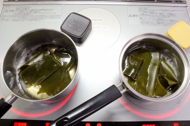 鍋に昆布水を入れて弱火にかけ、沸騰する直前に昆布を引き上げます。今回は、6分ほど煮出しました。昆布だしの味に違いがあるのか、実食!