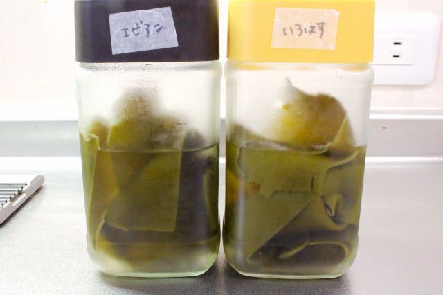 冷蔵庫でひと晩浸けたものがこちら。昆布が膨張して、ビンの中は昆布でぎっしり!