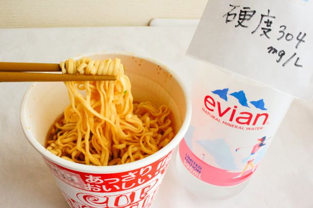 まずは「硬水のエビアン」で取った「昆布だし」で作った、カップヌードルから試食。
