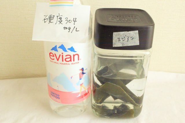 昆布だしは、硬度40mg/L以下の「軟水」を使うと、おいしいだしが取れると言われているそうです。今回は、硬度304mg/Lの「エビアン」と硬度40.3mg/Lの「いろはす」で昆布だしを取って、比較してみます。