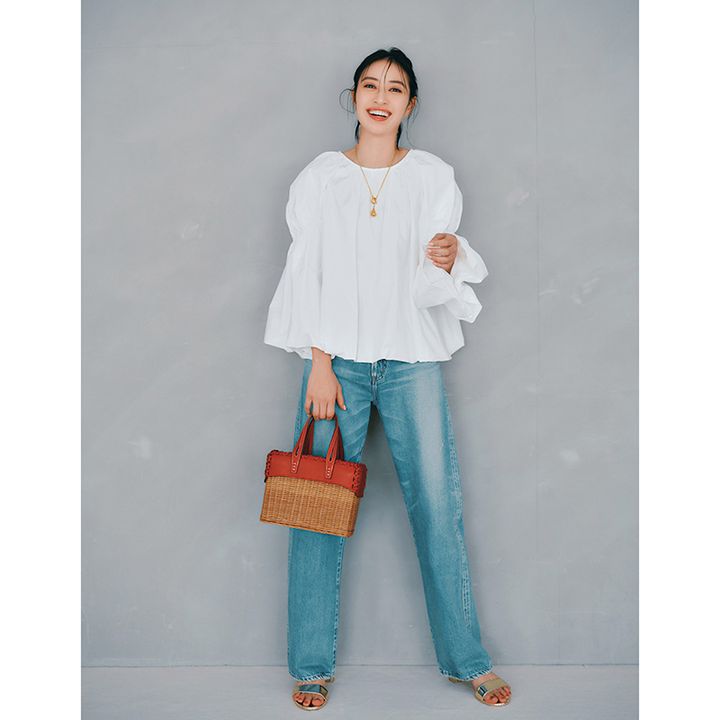 ブラウス¥16,500(エルド)デニムパンツ¥37,400(ニードバイヘリテージ/ゲストリスト)バッグ¥44,000(ア ヴァケーション/ノーベルバ)ネックレス¥30,580(ソコ/ZUTTOHOLIC)サンダル¥36,300(プリティ・バレリーナ/エフイーエヌ)