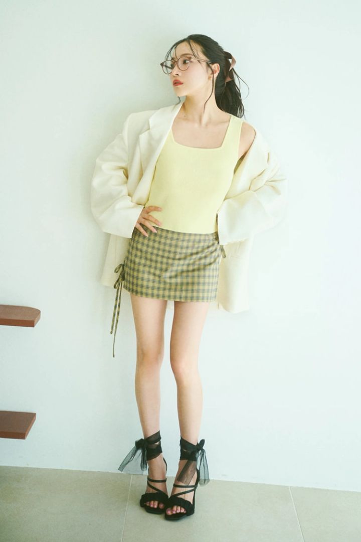 ジャケット 10,990円/ZARA(ザラ)タンクトップ 5,390円/LILLIAN CARAT(リリアン カラット)チェックスカート 11,110円/クランク(HANA KOREA)メガネ 11,000円/OWNDAYS イヤリング 2,200円/Osewaya(お世話や)サンダル 13,200円/RESEXXY リボン/スタイリスト私物