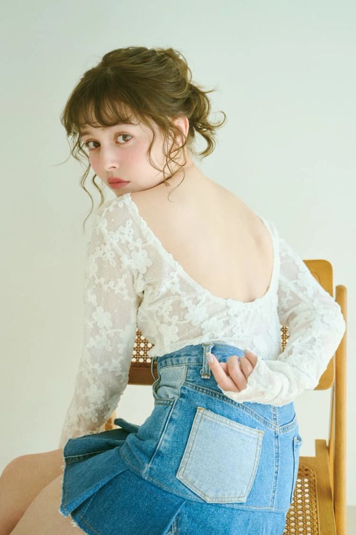 振り返るたびに視線をひとり占めできる色っぽい背中あきにキュン。男のコウケを狙うならレース×デニムでヘルシーに。そで口の親指を通せるデザインも可愛い♡