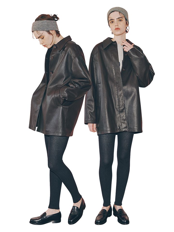 チュニック丈のビッグシルエットでレザーシャツを女っぽく。厚みがあることでオーバーサイズの立体感が増し、レギンスをはくときはミニワンピ風に着方のアレンジが可能。フェイクレザーらしいやわらかな風合い。