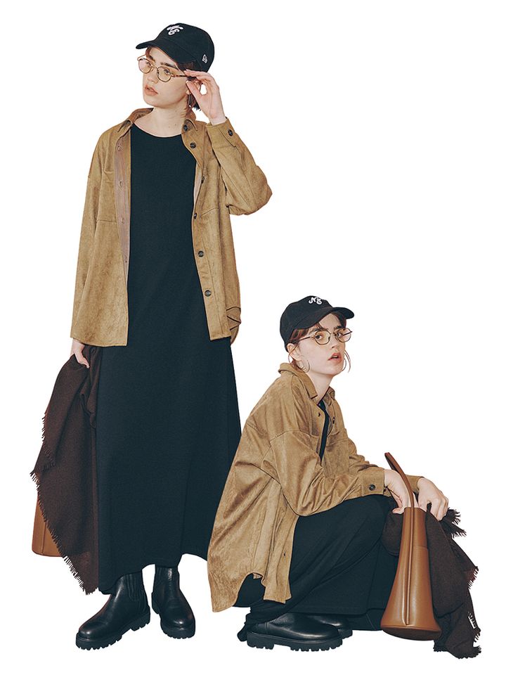 ベージュフェイクスエードシャツ/マイカ アンド ディール(MICA & DEAL 恵比寿店) 黒ワンピース/テイクス(Shinzone ルミネ新宿店) キャップ/ニューエラ 手に持ったストール/アソース メレ(アイネックス) ピアス/mimi33(サンポークリエイト) 眼鏡/ザベッドフォードホテル(キングスター) バッグ/ROH SEOUL ブーツ/カミナンド(グラビテート)