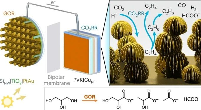 ミニチュアの葉っぱ工場”の断面図 / 図は“ミニチュアの葉っぱ工場”の断面図で、上のペロブスカイト層が太陽光を電気に換え、その電気が下の銅ナノフラワーへ流れ込む様子を描いています。銅の花びらに電子が届くと、取り込まれたCO₂が手をつなぎ直してエチレンなど2炭素の燃料分子に変身します。同時に余った正孔がグリセロールをゆるやかに酸化し、無駄なく副産物も作る──たった一枚のパネルで「光集め」から「燃料合成」までが一直線に進む仕組みをひと目で示した図です。/Credit:Virgil Andrei et al . Nature Catalysis (2025)
