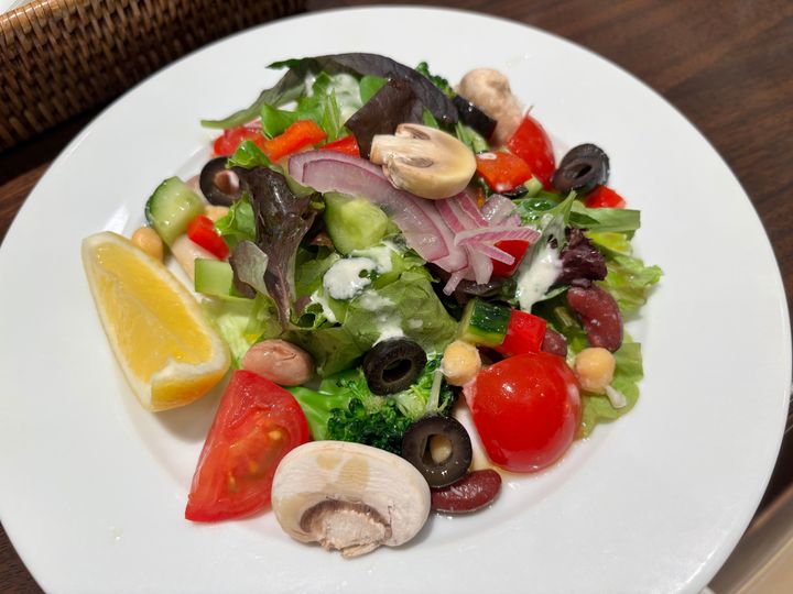 サラダにはオリーブやマッシュルームが入っており、大きなお皿にたっぷり。