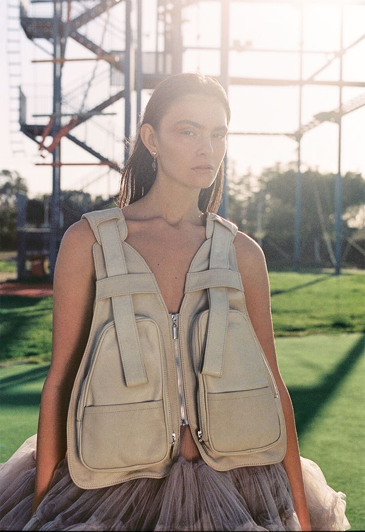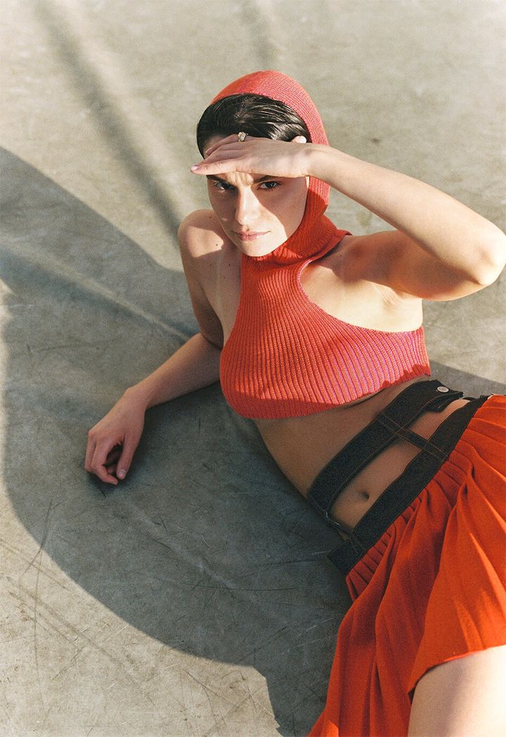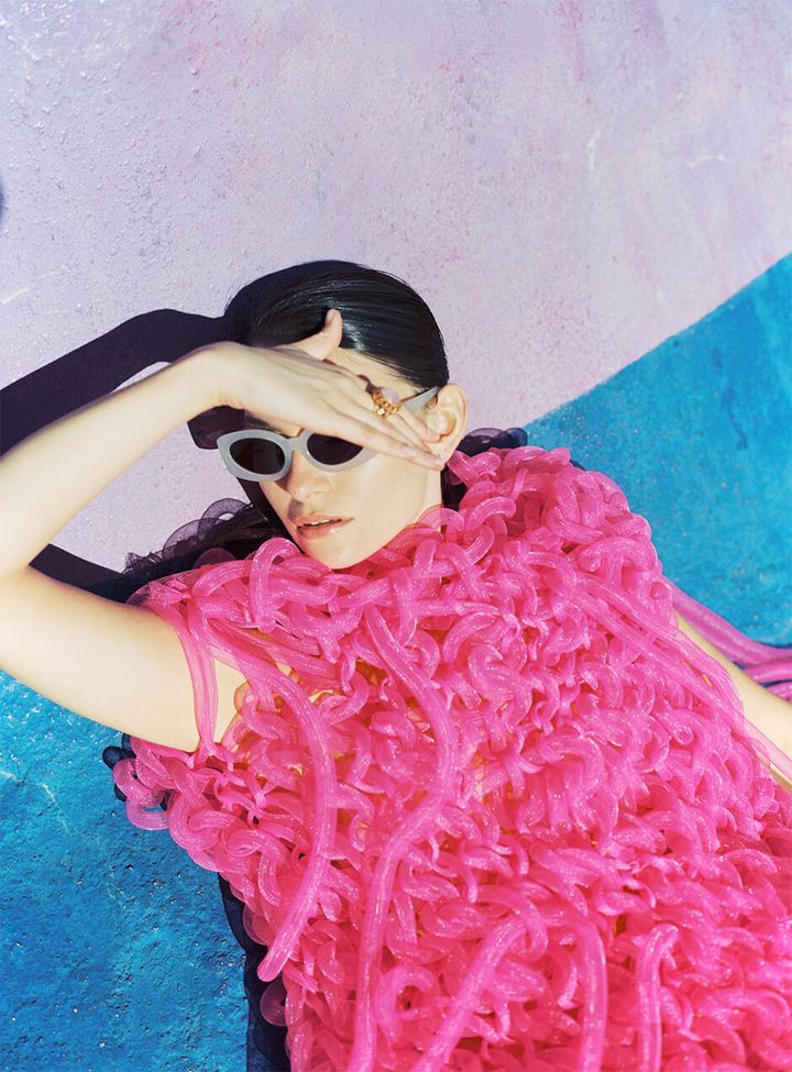 top, bra, trousers and shoes by MAYA GEVER, earrings and each ring by MAIM